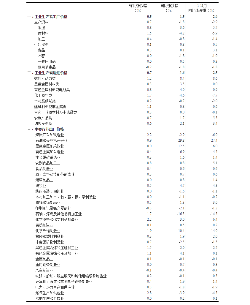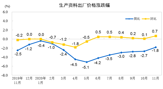 2020年11月份,全國工業生產者出廠價格同比下降1.5%,環比上漲0.5%;工業生產者購進價格同比下降1.6%,環比上漲0.7%。1—11月平均工業生產者出廠價格比去年同期下降2.0%,工業生產者購進價格下降2.5%。