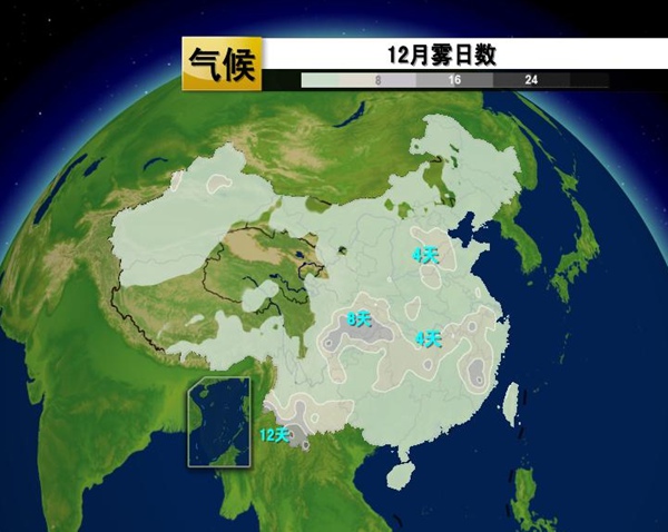 此外,進入12月, 華北黃淮等地大霧天氣頻發,尤其是天津、河南、河北中南部、山東西北部這一帶,12月通常是一年中出現大霧最頻繁的時期,平均有4天左右,輕霧出現的日數更多。