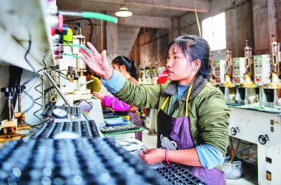 村民在雲南省鎮雄縣林口鄉木黑村扶貧車間內製作光學鏡片。新華社發