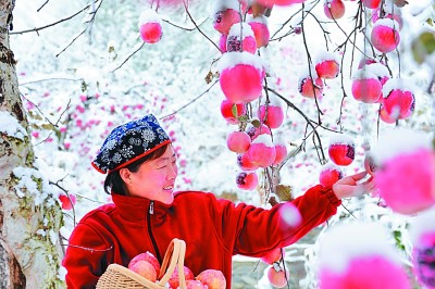 山東省沂源縣依託特色農產品發展鄉村遊,拓寬了當地果農脱貧增收渠道。圖為遊客在採收“雪果”。劉克偉攝/光明圖片
