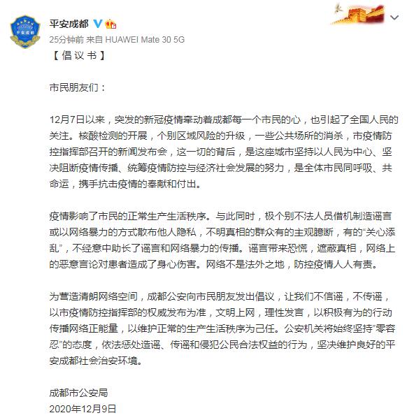 為營造清朗網絡空間,成都公安向市民朋友發出倡議,讓我們不信謠,不傳謠,以市疫情防控指揮部的權威發佈為準,文明上網,理性發言,以積極有為的行動傳播網絡正能量,以維護正常的生產生活秩序為己任。公安機關將始終堅持”零容忍”的態度,依法懲處造謠、傳謠和侵犯公民合法權益的行為,堅決維護良好的平安成都社會治安環境。