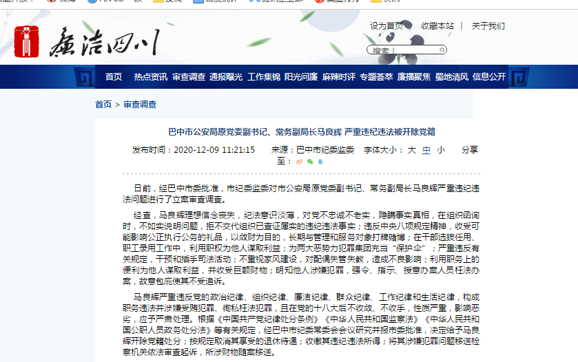 四川巴中市公安局原黨委副書記、常務副局長馬良輝嚴重違紀違法被開除黨籍