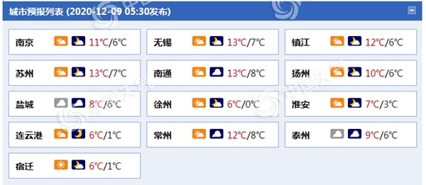 後天,江蘇淮河以南地區陰有小雨,其它地區多雲到陰。全省最高氣温10~11℃;12日早晨最低氣温:沿淮和淮北地區0~1℃,東南部地區7℃左右,其它地區2~3℃。