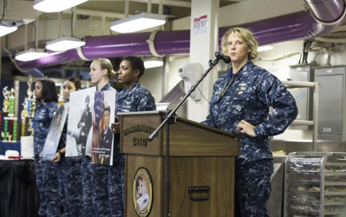 2017年3月,時任副艦長的艾米·鮑恩施密特(右一)在“林肯”號航母上發表講話。