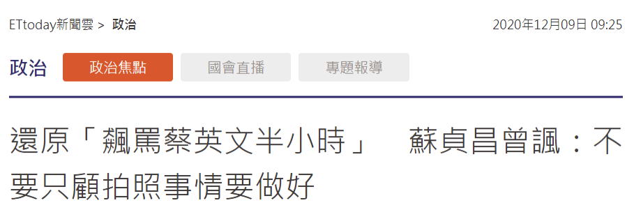 報道稱,因為致詞時蔡英文還未抵達,蘇貞昌接着稱,等下蔡英文來,要給她大掌聲,“實在講,擔這個擔子很困難,擔了才知輕重,不要看人家擔沒吃力,還嫌人家姿勢差”。蘇貞昌還説:“大家等下不要只顧着(跟蔡英文和蘇嘉全)拍照,把事情要做好,拍那張照才有價值。”