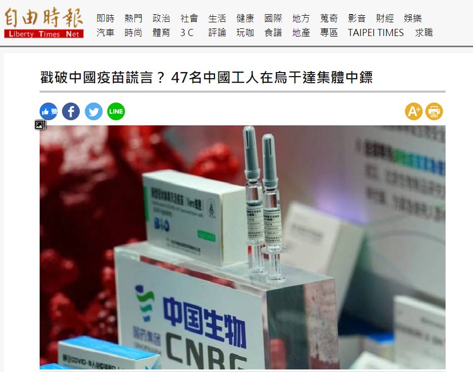 《環球時報》記者8日從在烏知情人士處瞭解到,上述47人並未接種新冠疫苗,綠媒上述報道完全是為攻擊大陸疫苗而編造的。