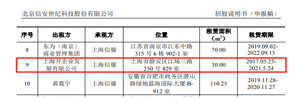 最後,信安世紀招股説明書披露,子公司上海信璇租賃上海市靜安區江場三路 250 號 829 室用於辦公,出租方為上海開企業發展有限公司;但《環球網》發現,全國並沒有一家商號為“上海開企業發展有限公司”的企業。對此,信安世紀表示,出租方完整名稱為“上海開創企業發展有限公司”,該公司可以查到工商登記信息。
