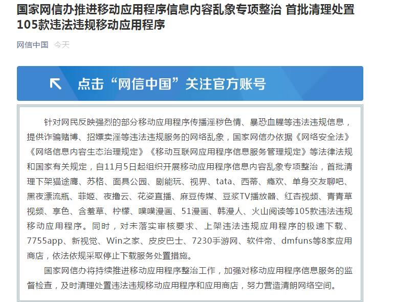 中國網12月8日訊 據“網信中國”微信公眾號今日消息,針對網民反映強烈的部分移動應用程序傳播淫穢色情、暴恐血腥等違法違規信息,提供詐騙賭博、招嫖賣淫等違法違規服務的網絡亂象,國家網信辦依據《網絡安全法》《網絡信息內容生態治理規定》《移動互聯網應用程序信息服務管理規定》等法律法規和國家有關規定,自11月5日起組織開展移動應用程序信息內容亂象專項整治,首批清理下架貓途鷹、蘇格、面具公園、劇能玩、視界、tata、西蒂、癮歡、單身交友聊吧、黑夜漂流瓶、菲姬、夜擼雲、花姿直播、麻豆傳媒、豆漿TV播放器、紅杏視頻、青青草視頻、享色、含羞草、檸檬、噗噗漫畫、51漫畫、韓漫人、火山閲讀等105款違法違規移動應用程序。