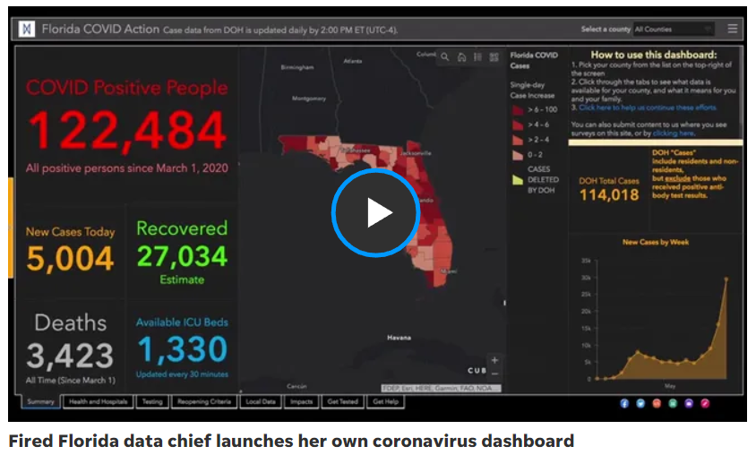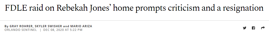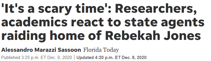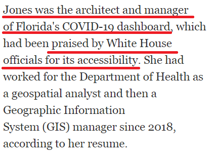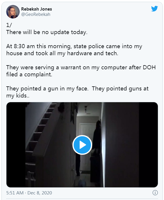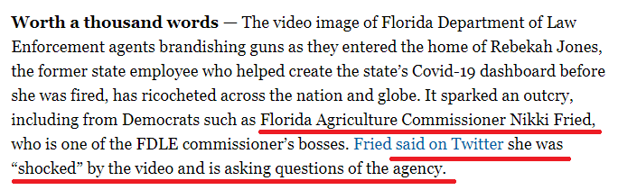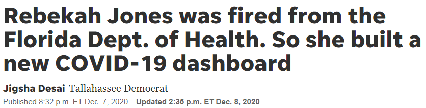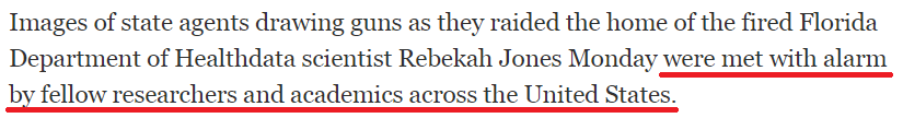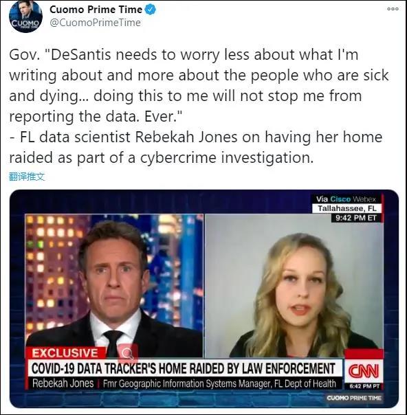 麗貝卡·瓊斯曾是佛羅里達州衞生部的數據平台負責人,因為拒絕按上級指令篡改疫情數據於5月被解僱。瓊斯接受美國有線電視新聞網(CNN)採訪時表示,此次警察突擊搜查她家並沒收其電子設備就是想徹底堵住她的嘴。