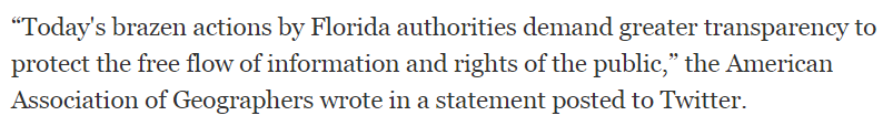 美國地理學家協會(AAG)在社交媒體上發表聲明稱:“基於佛州當局的無恥行為,我們要求提高透明度,以保護信息的自由流動和公眾的權利。”