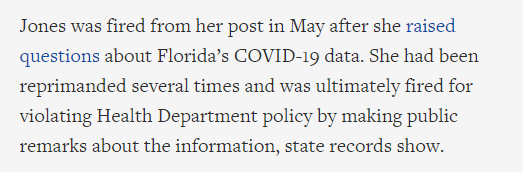 然而就是這樣一位科學家,卻因為“不聽話”在今年5月被佛州政府解僱。美國媒體援引佛州政府檔案記錄報道稱,瓊斯在職期間曾多次受到訓誡,最終因“未經授權就疫情數據公開發表評論、違反州衞生部政策”而遭解僱。