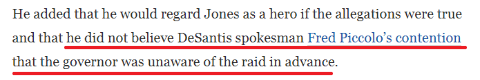 瓊斯:“他們拿走了我的手機以及我用來經營公司的筆記本電腦,手機裏有和我聯繫過的人的通話記錄,他們為州政府工作,與我秘密見過面並向我透露過一些消息,這可能會讓他們被解僱或陷入類似的麻煩。我現在想説,佛羅里達州州長德桑蒂斯甚至都不用找我談話就會很快知道這些,所以你們要小心了!”