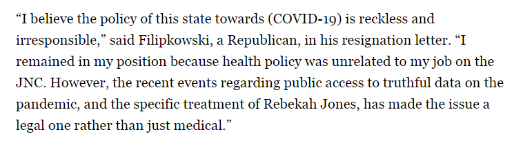 瓊斯事件發生後,菲利普科夫斯基辭去了自己在佛州法律界的職務。他在辭職信中寫道:“我認為佛州的抗疫政策是魯莽和不負責任的。我之前擔任這個職務是因為衞生政策與我的工作無關,但最近一系列阻撓公眾獲取真實疫情數據的事件以及麗貝卡·瓊斯的遭遇,讓這變成了法律問題,而不再只是個醫學問題。”