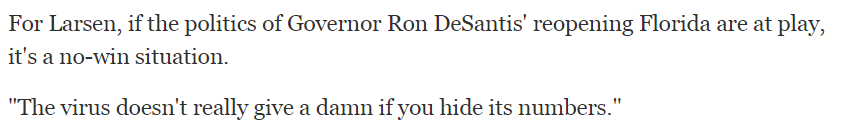 很多專家都認為,佛州的疫情惡化到今天這種地步,與州政府解僱瓊斯導致有效疫情數據不足有很大關係。用中佛羅里達大學研究員珍妮弗·拉森的話説,“限制數據就相當於在颶風來襲時中斷颶風預報”。她警告,州長德桑蒂斯的政治操弄會讓佛州抗疫一敗塗地。“如果你隱瞞疫情數據,病毒一點都不會在乎”。