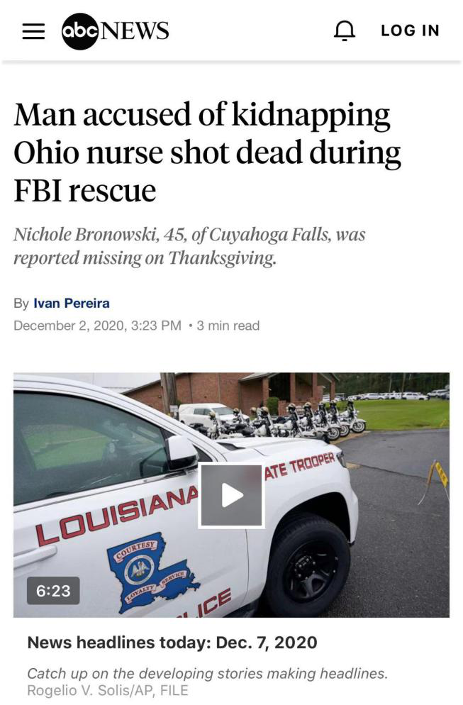 △美國廣播公司報道,一名俄亥俄州的護士被綁架,嫌犯已被擊斃