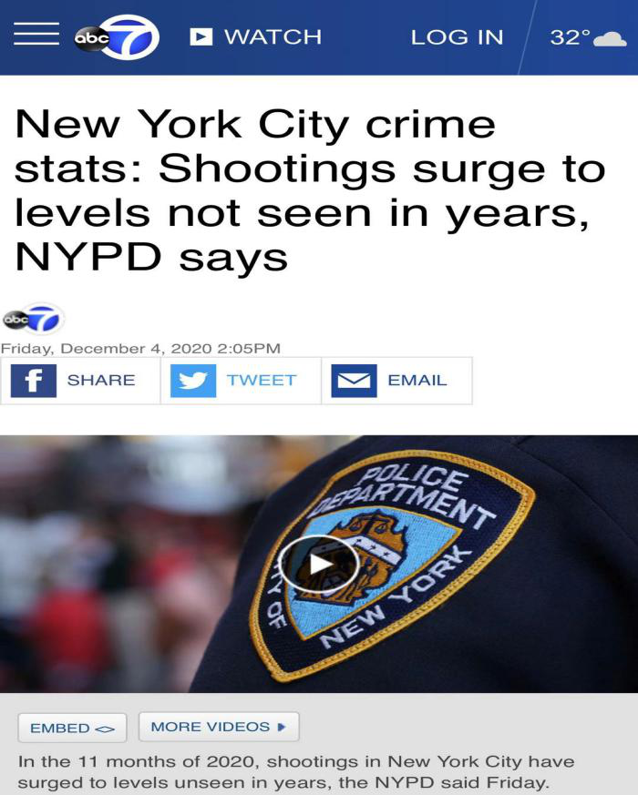 此外,在美國的一些惡性案件高發地區,犯罪率的飆升更加令人震驚。據美國廣播公司(ABC)的報道,紐約市今年發生的槍擊案遠超往年,根據當地警方披露,紐約市僅11月就發生了115起槍擊案,相比去年同期的51起飆升了112%。而在今年全年,紐約市已發生了1412起槍擊案,這一數字在去年同期僅為721起。