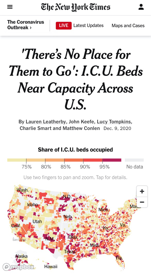 《紐約時報》指出,目前全國有超過三分之一的美國人生活在醫院資源嚴重缺乏的地區,甚至重症監護室也被新冠患者佔用得所剩無幾。服務人口超過1億人的美國各大醫院近日均表示,它們的重症監護病牀早在12月初便已緊缺,剩餘不到15%。
