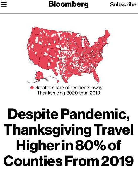 媒體指出,除了地方政府反對防疫限制,美國各地民眾同樣不顧疾控中心警告,在感恩節期間大肆串門。僅11月26日感恩節當天,美國就平均有約22%的人口不在家中,八分之一的人口出行至少30英里。而在蒙大拿、北達科他、南達科他,以及懷俄明州等疫情重地,其80%的縣中,居民出行比例均高出全國平均水平。
