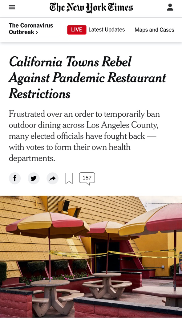 《紐約時報》報道,儘管美國地方司法管轄區並沒有正規程序允許自建衞生部門,但洛杉磯縣的西科維納、蘭卡斯特、比佛利山莊等地近日已發起並且通過投票,準備建立或者加入有獨立衞生部門的地區。報道指出,就連夏威夷花園、科默斯、英格爾伍德、西好萊塢等疫情嚴重的城市也開始考慮效仿,自立門户。