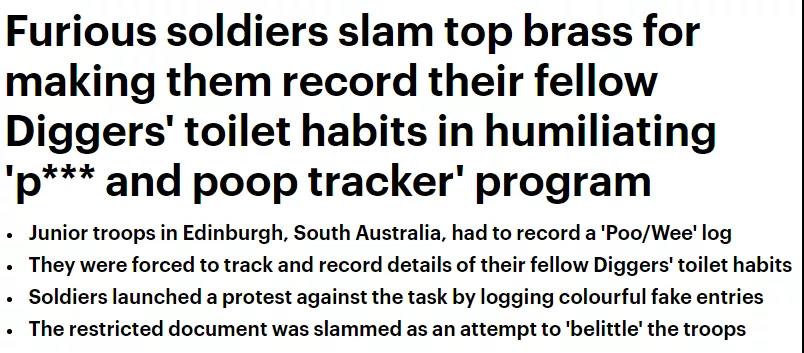 據英國《每日電訊報》6日披露,澳大利亞南澳州首府阿德萊德北部愛丁堡的澳軍第一裝甲部隊“B中隊”的士兵曾接到“奇葩”命令,被要求在其他士兵如廁時輪流站崗、檢查馬桶,並彼此記錄同伴的“如廁習慣”。