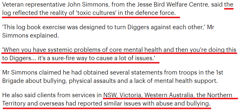 從事軍人福利工作的澳軍退伍老兵約翰·西蒙斯指出,這份日誌反映了澳國防軍中“有毒文化”氾濫的現實。“當你的核心心理健康出現系統性問題,就會對同伴們幹出這些事來……這肯定會引發很多問題。”