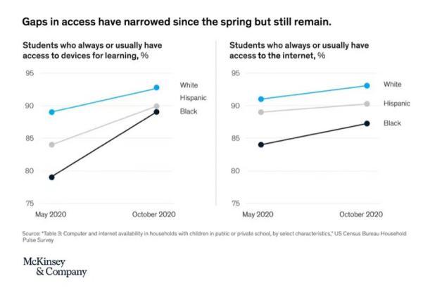 △麥肯錫公司調查數據顯示,疫情期間,白人學生擁有電腦和互聯網的比例高於少數族裔學生