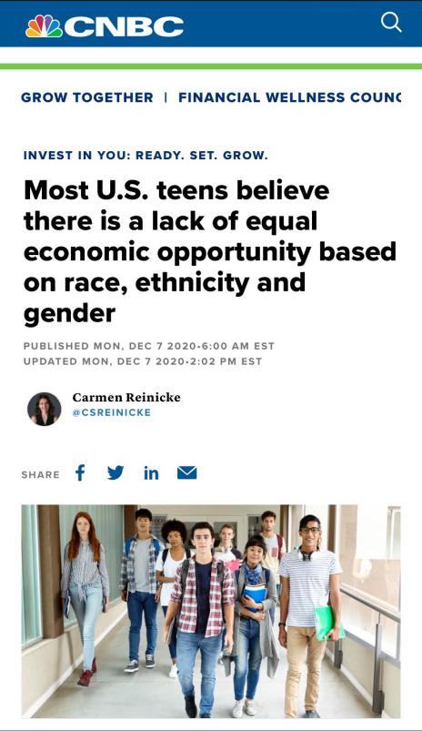 △CNBC報道,美國大部分青少年認為,受種族和性別等因素影響,美國社會中存在經濟機遇不平等的問題