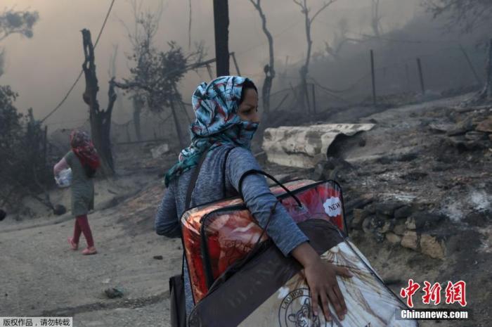 9月9日,希臘萊斯博斯島的莫里亞難民營發生大火後,一位移民帶着自己的物品離開難民營。Elias Marcou