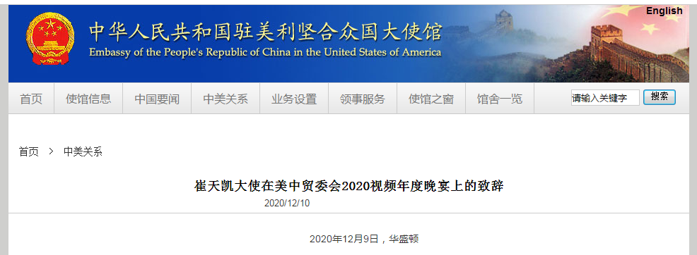 中國駐美國大使館網站12月10日刊登崔天凱大使9日在美中貿委會2020視頻年度晚宴上的致辭。全文如下: