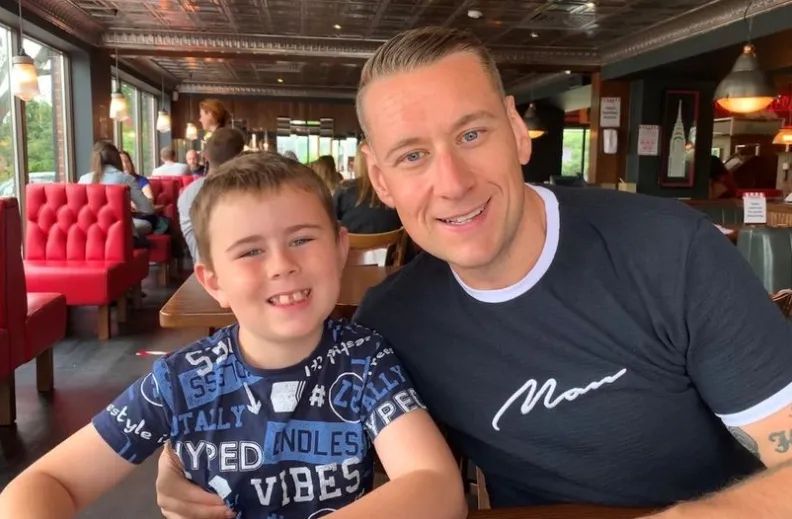 圖中摟着小男孩的帥氣男子就是男孩他老爸,