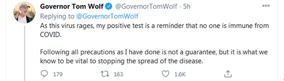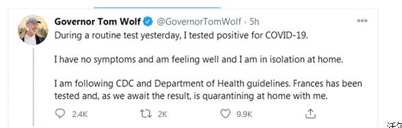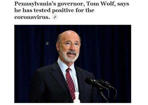 美國賓州州長自曝新冠檢測呈陽性,發推警告:“沒有人能對新冠免疫”
