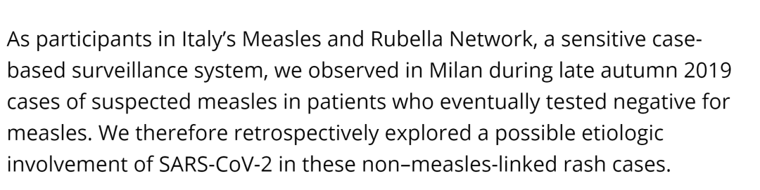 儘管如今報告這一發現的意大利學者,並沒有透露當時醫院在採集了這個樣本後有沒有發現並上報這種如今被我們確定為是新冠病毒的“未知病毒”,但這些學者表示,他們之所以如今會對該樣本進行檢測,是因為他們通過流行病檢測網絡發現去年秋季末期有一批出現疑似麻疹症狀的病例最終卻被查出麻疹陰性,這些學者因此決定從新冠病毒的角度入手對這些樣本進行重新檢測,看看會不會有什麼新發現,結果就發現了這麼一個特殊的病例。