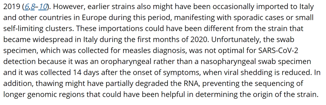 而在詳細閲讀了意大利媒體的報道和《新發傳染病》網站上的原文後,我們可以進一步確認來自意大利米蘭大學的學者們確實通過對一個在去年12月5日採集的咽拭子樣本進行了新冠病毒的監測後,發現這上面有新冠病毒的RNA序列。