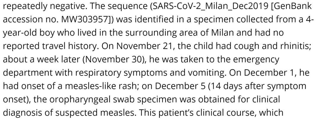 更重要的是,根據參與了這項研究發現的意大利學者的説法,這個樣本來自一個在去年11月21日就已經出現了咳嗽和鼻炎的4歲兒童。這些學者稱,這名兒童居住在米蘭周邊區域,而且沒有上報過旅行史,在11月21日出現上述病例後,孩子又在11月30日因為呼吸道感染和嘔吐而被送到了醫院急診,並在12月1日出現了類似麻疹的皮疹。於是,在12月5日,也就是這名兒童最先出現症狀的14天后,醫院因為懷疑是麻疹而給孩子做了咽拭子採樣。
