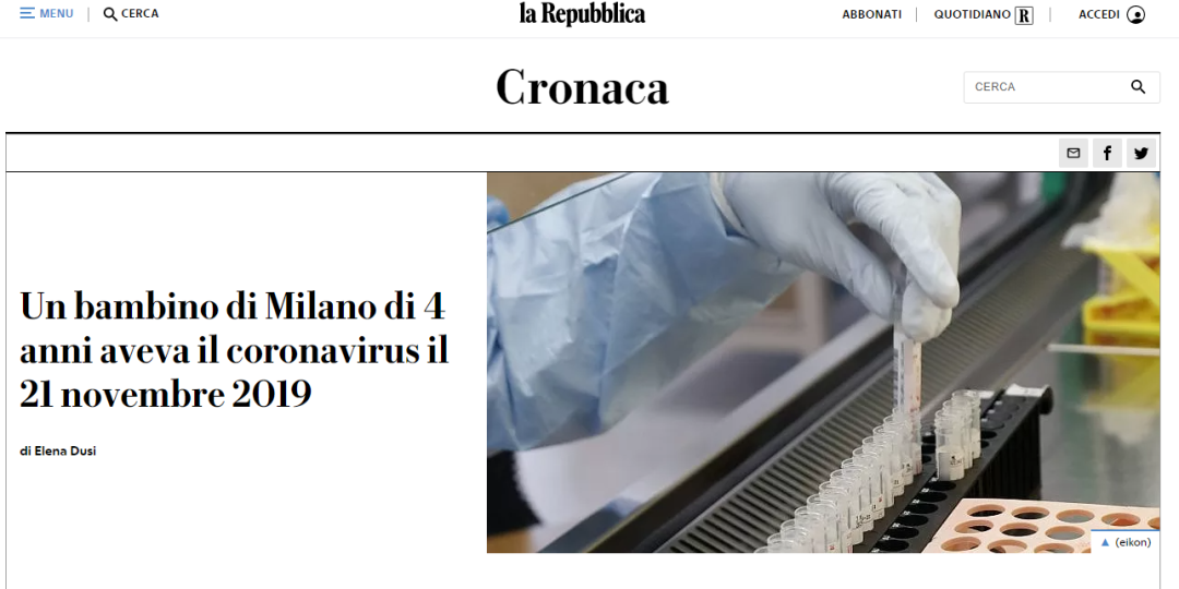 據意大利《共和報》報道,該國一名兒童於去年11月底曾出現了咳嗽、鼻炎、呼吸道感染以及皮疹等症狀,並於去年12月5日採集了咽拭子樣本。