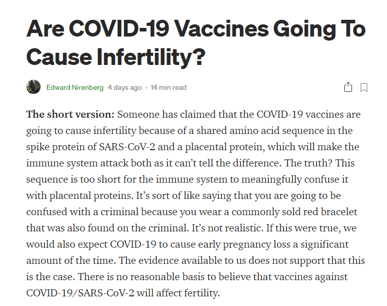 更重要的是,一位名叫Edward Nirenberg的美國疫苗科普作者,還詳細地從科學的角度揭露了兩人此次散佈的新冠疫苗可能導致女性“不育”的謠言。