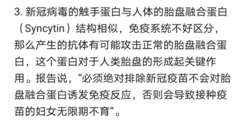從微信朋友圈目前正在傳播的那則中文版的謠言來看,那兩名“科學家”宣稱新冠疫苗會導致女性“不育”的理由是,新冠病毒的“觸手蛋白”與人體的“胎盤融合蛋白”存在“結構相似”,“免疫系統不好區分”,所以一旦注射新冠疫苗,讓人體產生了病毒抗議,這個抗體就會“攻擊”正常的胎盤融合蛋白,導致婦女“不育”。