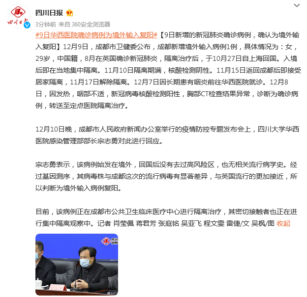 【9日新增的新冠肺炎確診病例,確認為境外輸入復陽】12月9日,成都市衞健委公佈,成都新增境外輸入病例1例,具體情況為:女,29歲,中國籍,8月在英國確診新冠肺炎,隔離治療後,於10月27日自上海回國。入境後即在當地集中隔離。11月10日隔離期滿,核酸檢測陰性。11月15日返回成都後即接受居家隔離,11月17日解除隔離。12月7日因長期患有咽炎前往華西醫院就診。12月8日,因發熱,咽部不適,新冠病毒核酸檢測陽性,胸部CT檢查結果異常,診斷為確診病例,轉送至定點醫院隔離治療。
