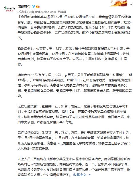 【今日新增病例基本情況】12月9日18時-12月10日18時,我市疫情防控工作繼續有序開展。郫都區在已實施隔離觀察的密切接觸者第二輪核酸檢測篩查中,檢出4例陽性,其中確診病例2例,無症狀感染者2例。截至今日18時,本起疫情累計報告新冠肺炎確診病例8例,無症狀感染者3例。現將今日新增病例基本情況通報如下。
