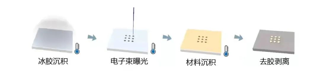 “當電子束打在冰層上,被打到的冰自行消失,因為電子束將水分解氣化,這樣就能直接雕刻出冰模板,不需要像傳統光刻那樣用化學試劑清洗一遍來形成模具,從而規避了洗膠帶來的污染,以及難以洗淨的光刻膠殘留導致良品率低等問題。”趙鼎解釋説。