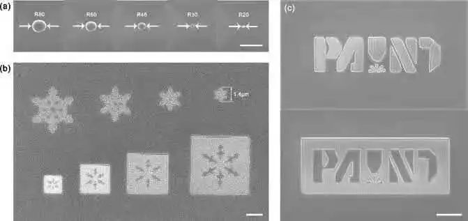 在薄至300納米的冰膠上刻畫圖案,圖中最小的微型雪花直徑僅1.4微米,所有比例尺長度均為1微米。