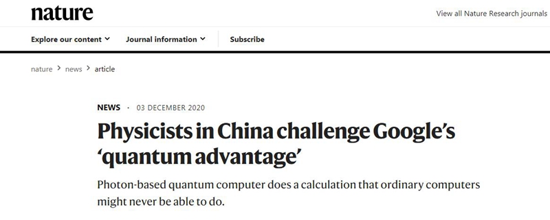 英國《自然》雜誌以《中國物理學家挑戰谷歌“量子優越性”》為題對這一成果進行報道。圖片來源:自然雜誌官網