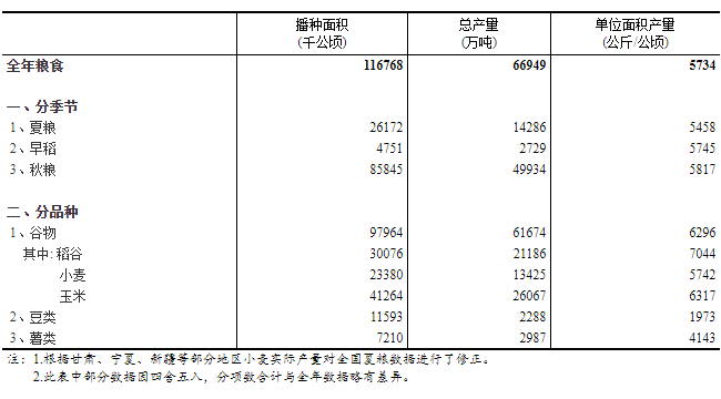 2020年,夏糧和早稻產量分別為2857億斤和546億斤,比上年增加25億斤和21億斤;秋糧產量9987億斤,增加67億斤。全年糧食總產量達到13390億斤,增加113億斤,增長0.9%。