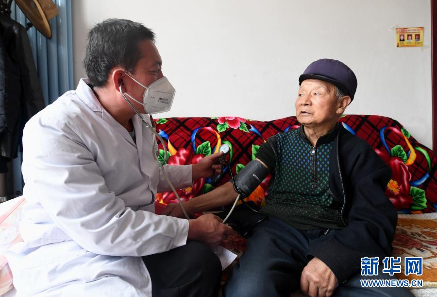 河北阜平縣龍泉關鎮顧家台村村醫為村民測量血壓(4月15日攝)。新華社記者 王曉 攝