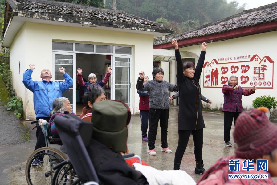 12月4日,在江西省撫州市黎川縣德勝鎮德勝村“幸福之家”養老服務站,工作人員帶領居民一起做操鍛鍊身體。新華社記者 胡晨歡 攝