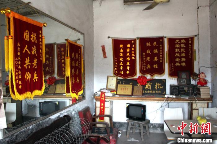 圖為孫晉良早些年同老伴一起居住的老房子,現已年久失修。推看門便能看到,印有“抗戰老兵 國人共仰”等字樣的錦旗掛滿整個堂屋。 沙見龍 攝