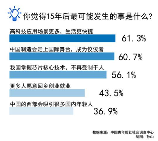 近日,中國青年報社社會調查中心針對6-14歲少年兒童進行的“你心目中15年後的中國什麼樣”調查顯示,對於15年後最有可能發生的事,61.3%的受訪少年兒童相信,高科技應用場景更多,生活更快捷,60.7%的少年兒童認為中國製造會走上國際舞台,成為佼佼者,56.1%的少年兒童相信我國會掌握芯片核心技術,不再受制於人。