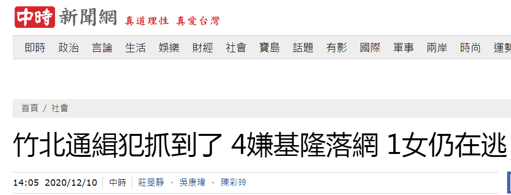 【環球網快訊】台灣中時新聞網剛剛消息稱,台灣竹北劫囚案5名嫌疑人全都落網。不過,報道稍晚更正消息稱,目前已有4人落網,仍有一位李姓女子在逃。