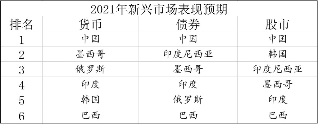 “新興市場的觀察者對近期的股市漲勢延續至明年充滿信心。”彭博社12月8日報道稱,在上個月對63名國際投資者、策略師和交易師進行的調查結果顯示,新冠疫苗的接種效果可能和各國財政寬鬆政策,以及中國經濟走勢一起成為影響明年新興市場的關鍵因素。目前發展中國家股票和債券總體規模超過33萬億美元,甚至超過美國、德國和日本三國的經濟總量之和。不過,新興市場彼此之間差異性極大,受訪者普遍看好亞洲股市和貨幣匯率走勢,特別是對中國股市、債券和貨幣匯率這三大指標的走勢信心在12個主要新興市場經濟體中全部排名居首(如圖)。
