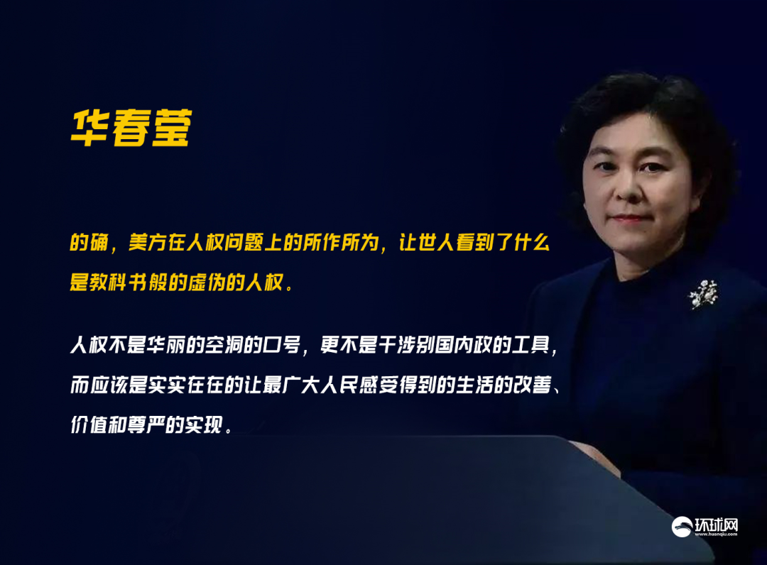 華春瑩回答:你的觀察非常敏鋭。*的確,美方在人權問題上的所作所為,讓世人看到了什麼是教科書般的虛偽的人權。*我們的確需要好好的思考一下,究竟什麼是人權?究竟應該由誰來定義人權?